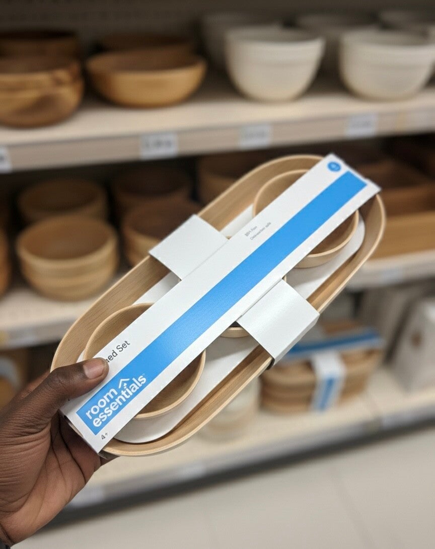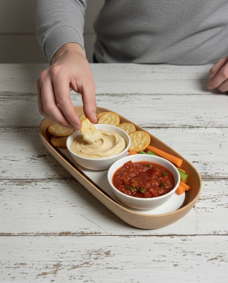 Appetizers and dips from the Room Essentials brand consists of 4 pieces with a modern and refined design. It includes a long oval tray with a light wood look and three matching small bowls, perfect for presenting your chips, vegetables and sauces during your aperitifs.
