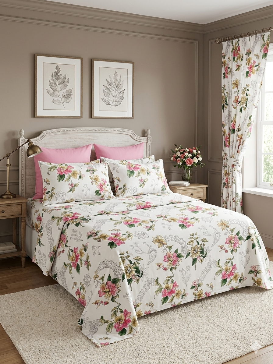 This photograph captures a cozy and inviting bedroom setting, featuring a coordinate set of bedding and matching curtains. The focal point is a neatly made bed with a tufted headboard, adorned with several pillows and a comforter, all displaying a pattern of large, detailed floral blooms on stems. To the side, a simple bedside table holds a lamp. Two framed botanical line-art prints hang on the wall above the bed. Next to the bed is a window framed by draped curtains that feature the same floral pattern, offering a soft filter for the light coming in. A plush area rug sits at the foot of the bed on the light-colored flooring, adding to the room's elegant and comfortable feel.